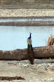 After breakfast, I joined the German couple for a jeep safari to the northern tip of the park right on the Bhutan Border. There is a small lodge at the border where we had lunch then headed off for a hike across the border into the Royal Manas park of Bhutan. No one minds if you cross for a short time here as the only road access is through India, otherwise its a very long walk to the nearest road in Bhutan. On the way back We stopped at a Fig tree that had plenty of ripe fruit and was just teaming with birds. As it turned dark we spent some time waiting for a couple of elephants to leave the grass and come out into the road. Very little animal activity in the dark tonight, the evening was quite cool. The Assamese were bundled up like winter, even the German's were putting on jackets. They were amazed that I was not cold, story of my life.